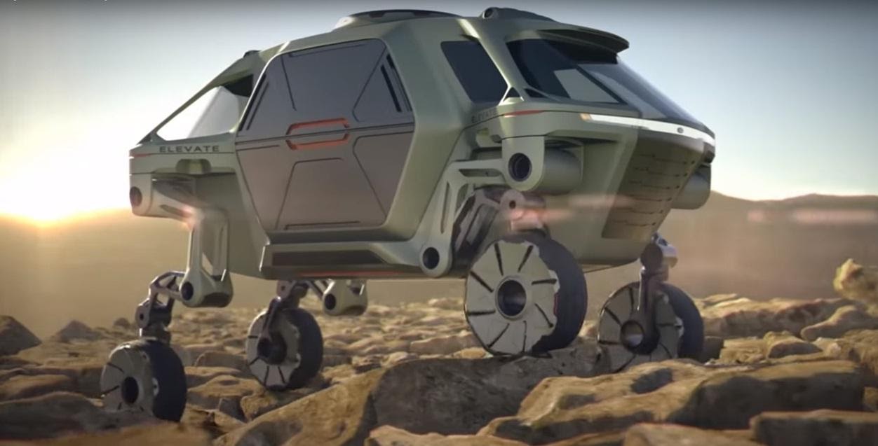 Hyundai Elevate представляет собой роботизированный трансформер со «складывающимися ногами», которые оснащены колесами. В случае необходимости колеса убираются, и вместо этого автомобиль в буквальном смысле перешагивает препятствие. Инженеры убеждают, что Hyundai Elevate может таким образом «перешагнуть» двухметровый забор.